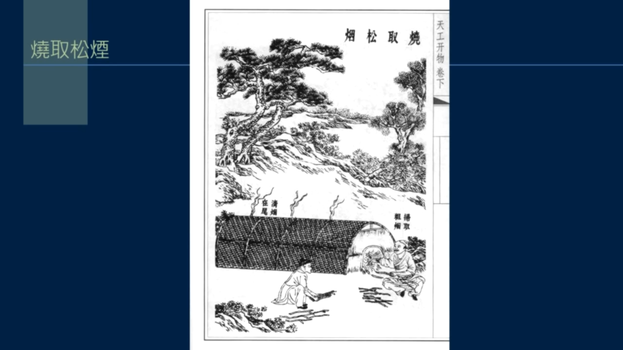 後來掌握了燒木取煙的技術,可以取得高質量的碳粉,大約從東漢開始,一直到明代,松煙都是製墨的主要原料。宋應星《天工開物》說,當時製墨: