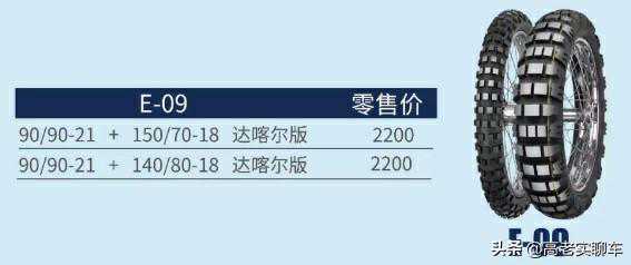 我们为那些追求极致越野乐趣的大神们准备了一套E09,只为那些真正的驴友KTM1290ADVENTURER而来。而且这款胎是KTM全球形象大使ChrisBirch的指定用胎,是不是有点儿心动了。当然了,HONDACRF1000LAfricaTwin不朽的非双也可以使用这套轮胎。