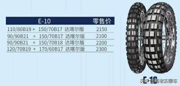 E10这个型号跟E09非常的类似,具有强大的耐穿刺能力,适应泥地以及雪地的路况,并且非常的耐磨,同时还提供了更多的尺寸供大家去选择。120/80B19配合170/70B17这款轮胎适合BMWR1200GS或者是BMWR1200GSADV车型使用。