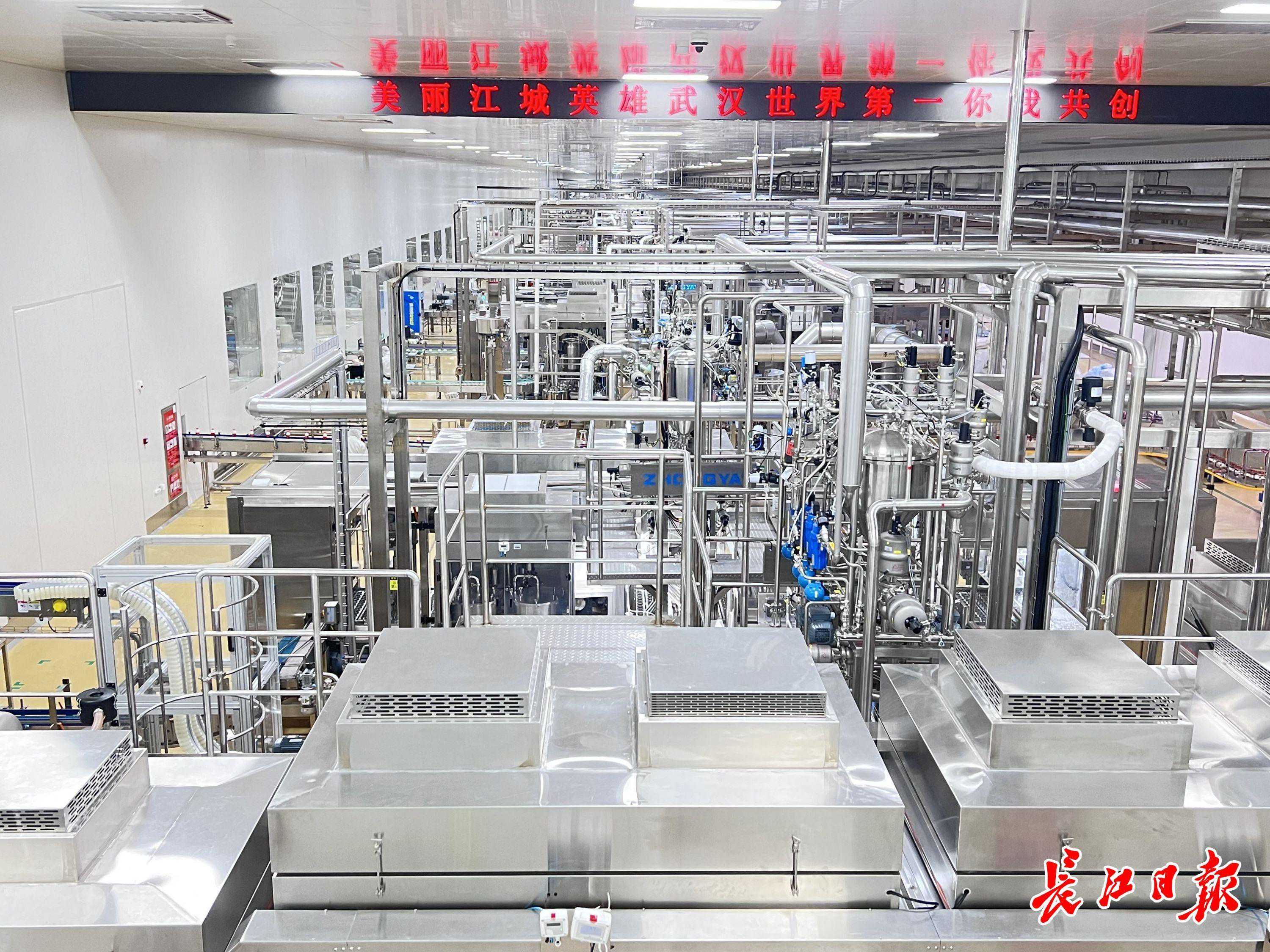 记者透过蒙牛高科武汉工厂参观走廊的透明玻璃看到,一盒盒酸奶产品在自动化产线上快速下线,预处理、灌装、包装等环节分秒不停。