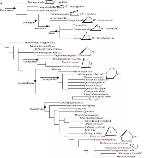 图2(a)虚骨龙类桡腕骨角度演化;(b)窃蛋龙类系统发育结果及桡腕骨角度演化,红色为具有桡腕骨角度测量数据的窃蛋龙类物种(裘锐供图)