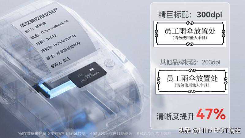在打印品质上,悟界M2搭载进口国际品牌打印头,300dpi高清分辨率,相比于市面上普遍的203dpi,M2显字更清晰,打印锯齿感更小,细节更精致,可以更好的实现同等尺寸的标签纸,打印的内容更多,支持的字体更小。