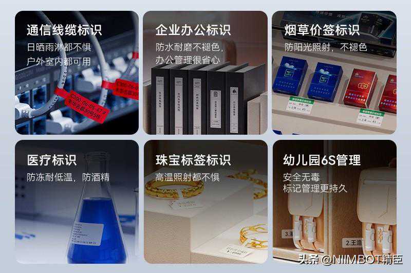 由于悟界M2采用的热转印打印原理技术,打印的标签标识保存时间相比于热敏更长,更耐用,根据使用材质特性,结合行业及内部实验数据,预估在通常使用环境下,热转印打印的字迹留影时间为8-10年,另外,热转印技术打印的标签拥有耐高温,耐化学腐蚀液体,以及防水防油的特性,能够更好的服务于更多对标签管理和标识有严格时间要求的行业,如通信线缆行业、医院医疗行业、企业办公标识、珠宝饰品行业、幼儿园6S管理以及烟草价签等场景。