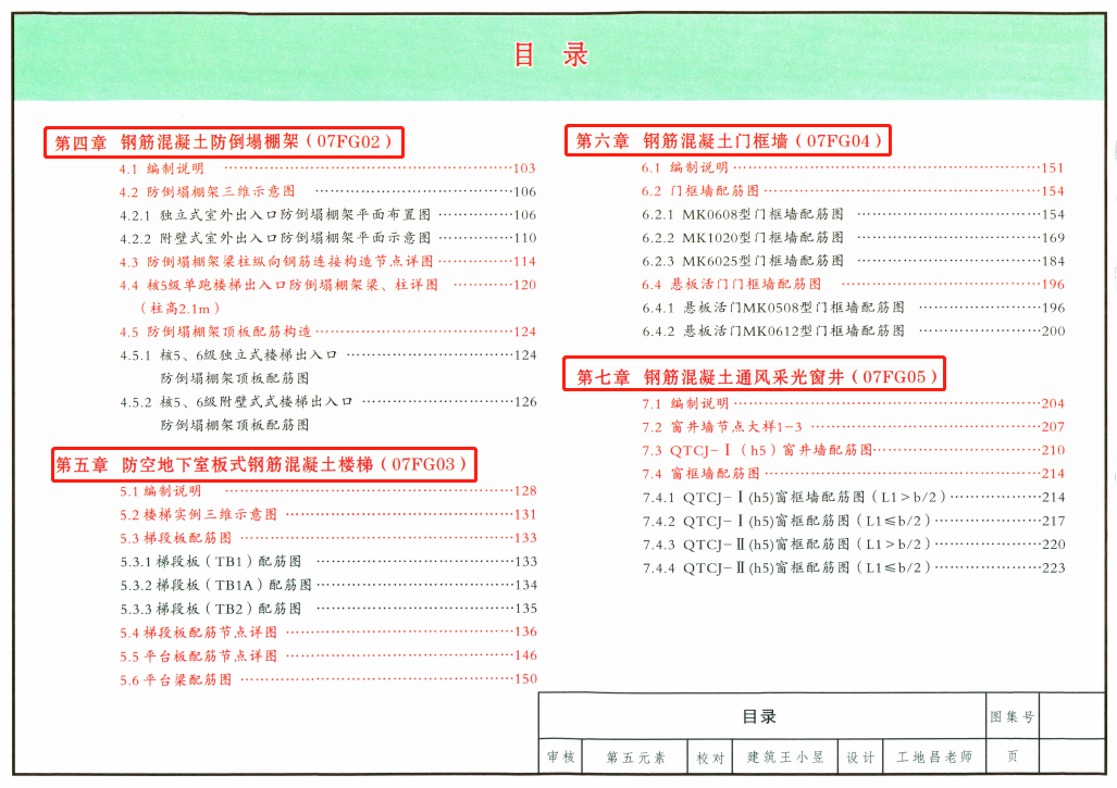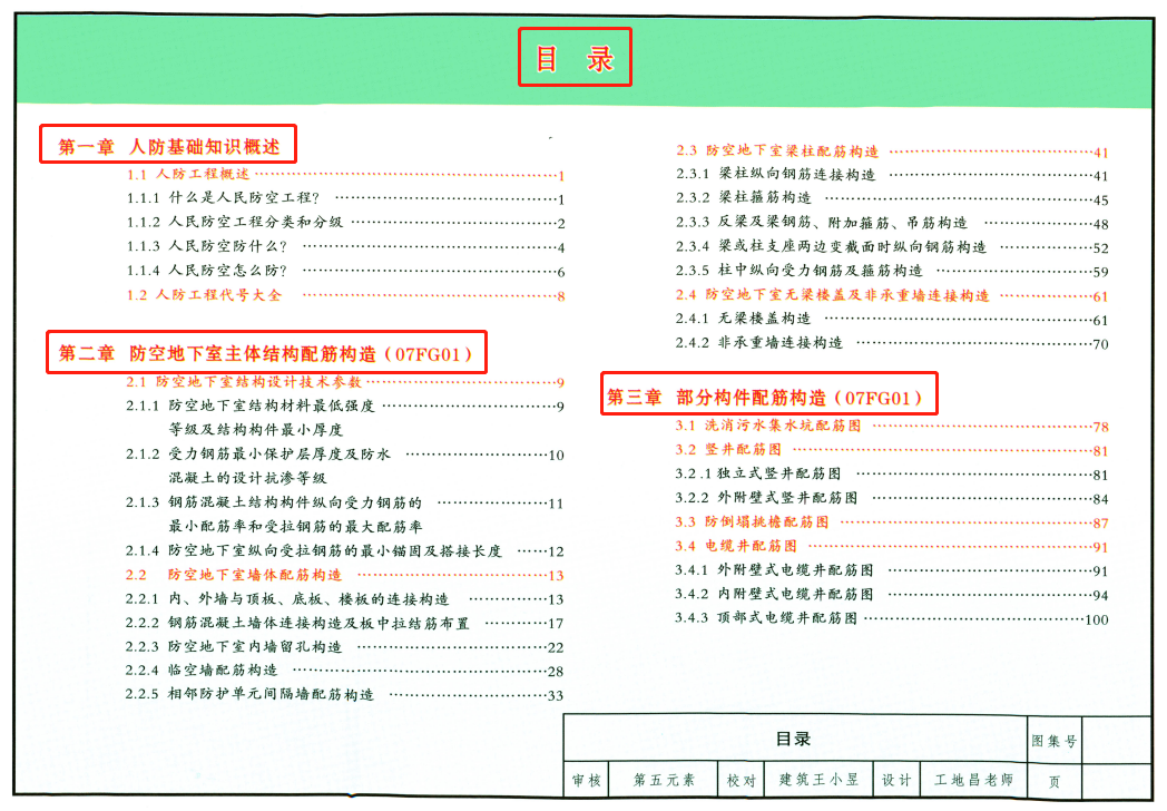 主要就是以防空地下室结构设计图集(07FG01-05)为主线,然后穿插了一些关于人防基本概念、人防的建筑设计和人防的防护设备等知识,在进行识图的前提下还让咱们学习一下专业术语。