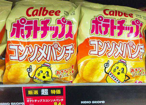●洋芋片:很多人到日本喜欢买洋芋片回中国,知名洋芋片大厂Calbee(カルビー)就推出了好几种不同的洋芋片,口味上也非常多元,像是法式清汤(コンソメ)、薄盐(うすしお)、海苔盐(のりしお)…等。