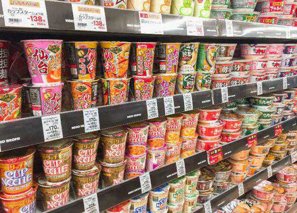 ●泡面:只要有热水就能吃的泡面是众多人来日本的必败商品,基本的口味有豚骨(とんこつ)、酱油(しょうゆ)、海鲜(シーフード)、盐味(しお)等等。而日本泡面的厂商虽然多,但几乎每家的泡面质量都很不错,像是日清的CUPNOODLE、どん兵卫都很受中国民众喜爱。还有可以干吃的炒面也很受欢迎,著名的包括日清的日式炒面UFO(焼そばUFO)和明星食品的一平夜店日式炒面(一平ちゃん夜店の焼そば)。