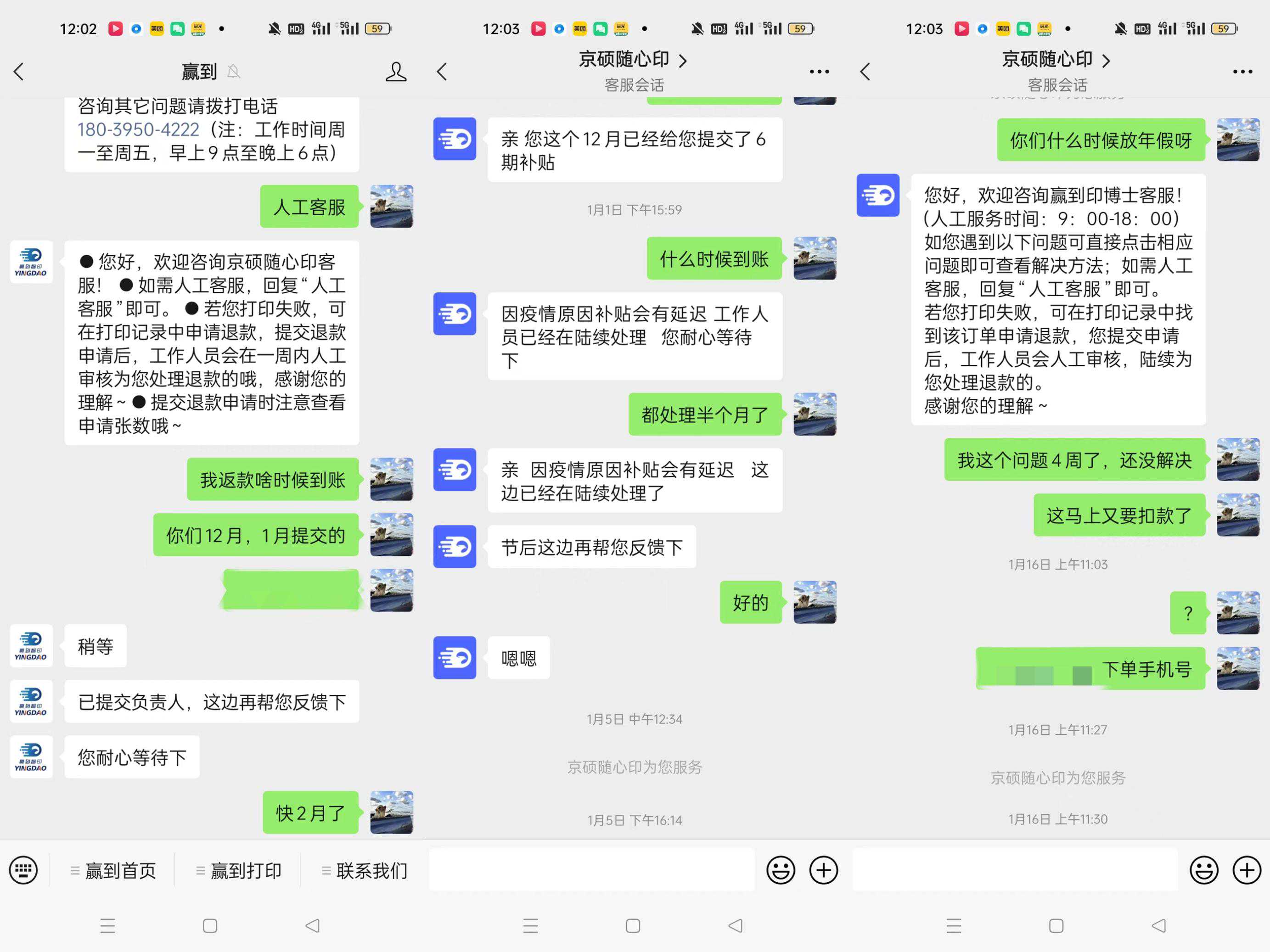 “前期返现补贴金一直都准时准点,所以后期就没注意。”去年12月,王女士发现已经半年没收到返现的钱了,随后她第一时间在“赢到”公众号上联系客服反映情况,商家回复:“因疫情原因补贴会有延迟,工作人员已经在陆续处理,请您耐心等待。”王女士又等待了两个月,但是仍然没收到钱。“我就希望商家能尽快将返现的租金退给我,我还想继续正常租用打印机。”王女士说。