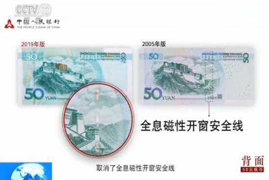 新版50元纸币背面调整了主景图案造型与层次效果,调整了面额数字、胶印对印图案的样式,取消了全息磁性开窗安全线,取消了右下角局部图案并适当留白,年号改为“2019年”。