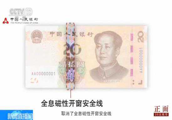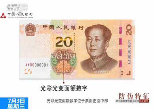 在防伪特征方面,光彩光变面额数字位于票面正面中部,改变钞票观察角度,面额数字“20”的颜色在金色和绿色之间变化,并可见一条亮光带上下滚动。
