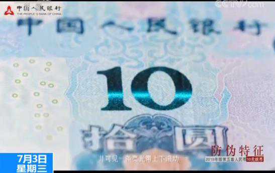 在防伪特征方面,光彩光变面额数字位于票面正面中部,改变钞票观察角度,面额数字“10”的颜色在绿色和蓝色之间变化,并可见一条亮光带上下滚动。