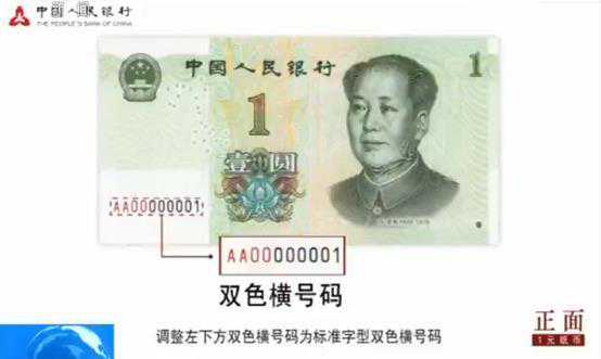 调整左下方异型双色横号码为标准字型双色横号码,取消了左下角光变油墨面额数字,右侧增加了动感光变镂空开窗安全线和竖号码。
