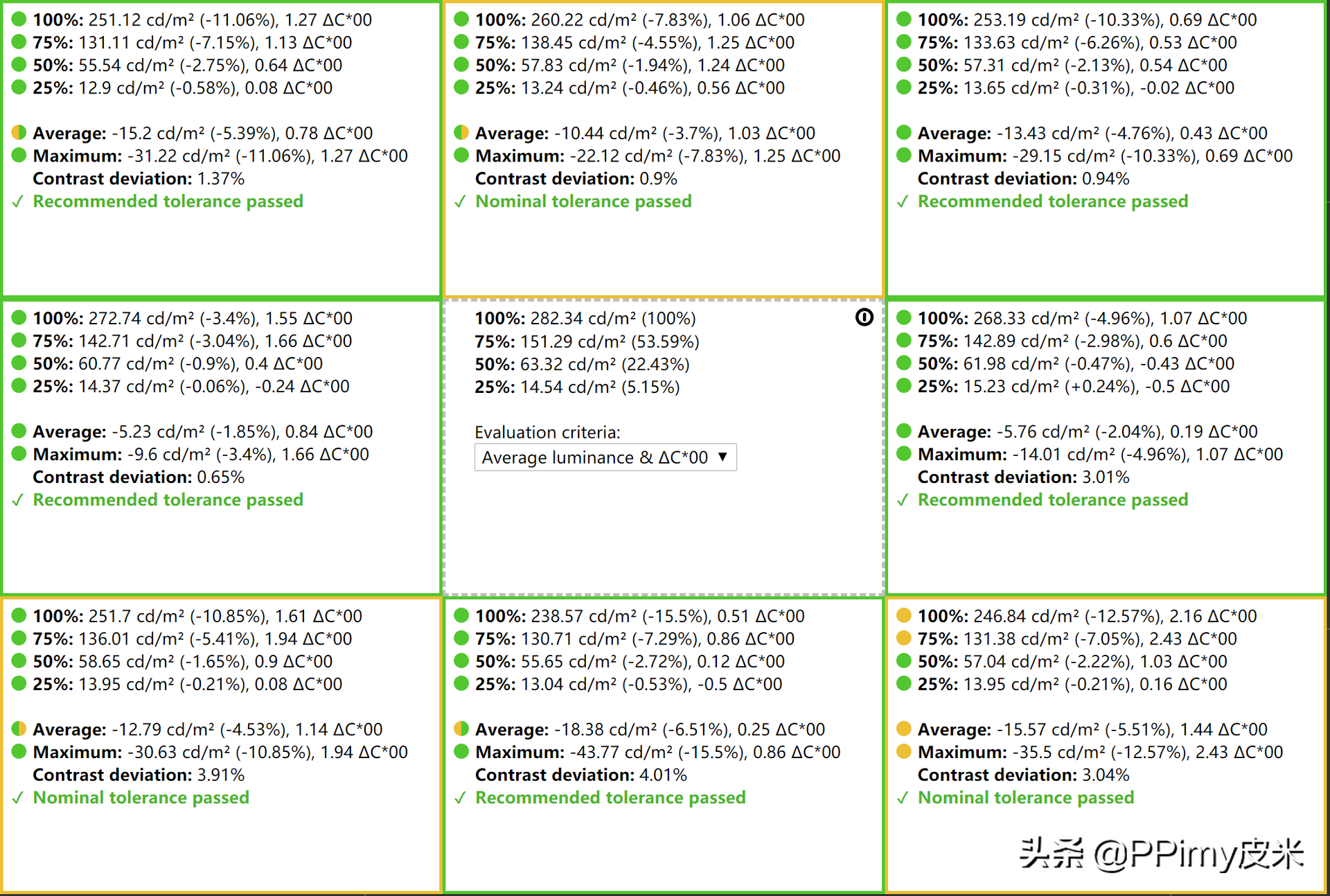 屏幕均匀度测试,屏幕整体表现不错,除了右下偏差幅度稍大,其他区域表现都非常好,右下角主要崩在75%-100%亮度时的色度差,不过这么大的显示器,有这样的表现已经很不错了。