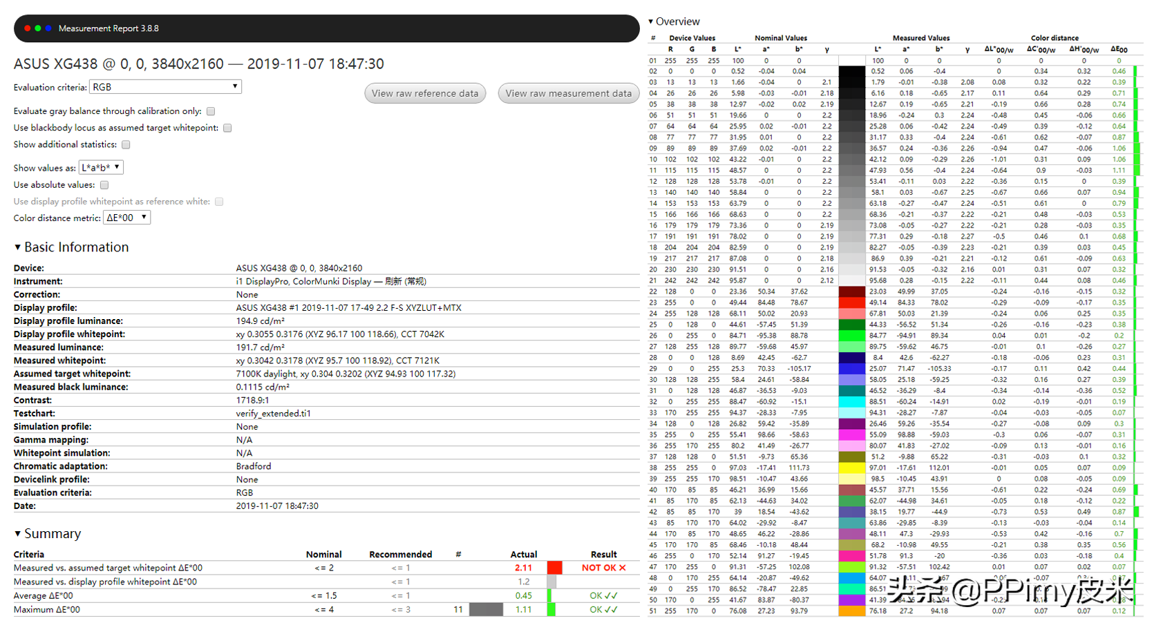 色准表现非常好,平均△E为0.45,最大△E也仅仅只有1.11,△稍微超了一点,主要表现在色温稍微偏冷了一点,稍微调教就好了,影响不大。
