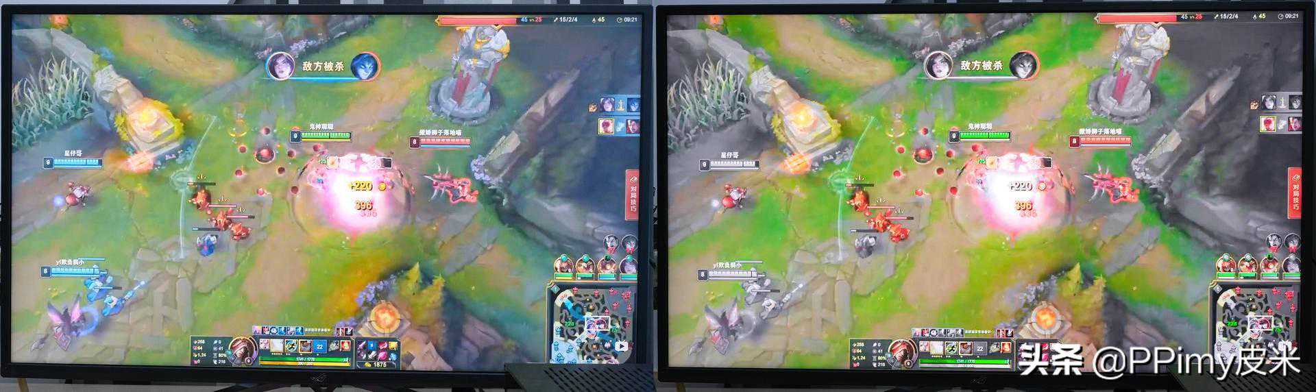 不过我觉得最有意思的游戏优化就是moba模式了,和其他模式主要调节暗部表现和亮度为主不同,moba模式直接抹去了蓝色。这个模式可以说是专门为LOL设计的,开启MOBA模式后,友军小兵和队友血条直接变成了黑白,红色的敌方目标和自己的绿色状态变得更加显眼了,能够让你对线和团战的时候更加专注。在43''屏幕上,你还可以把视野拉的更远,更精准的掌握战局。