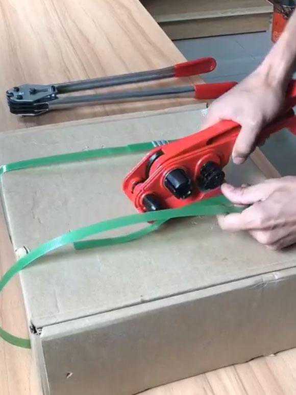 手动塑钢带打包机仅可使用PET塑钢带打包带进行打包,并且它需要配合铁扣才能进行锁紧。