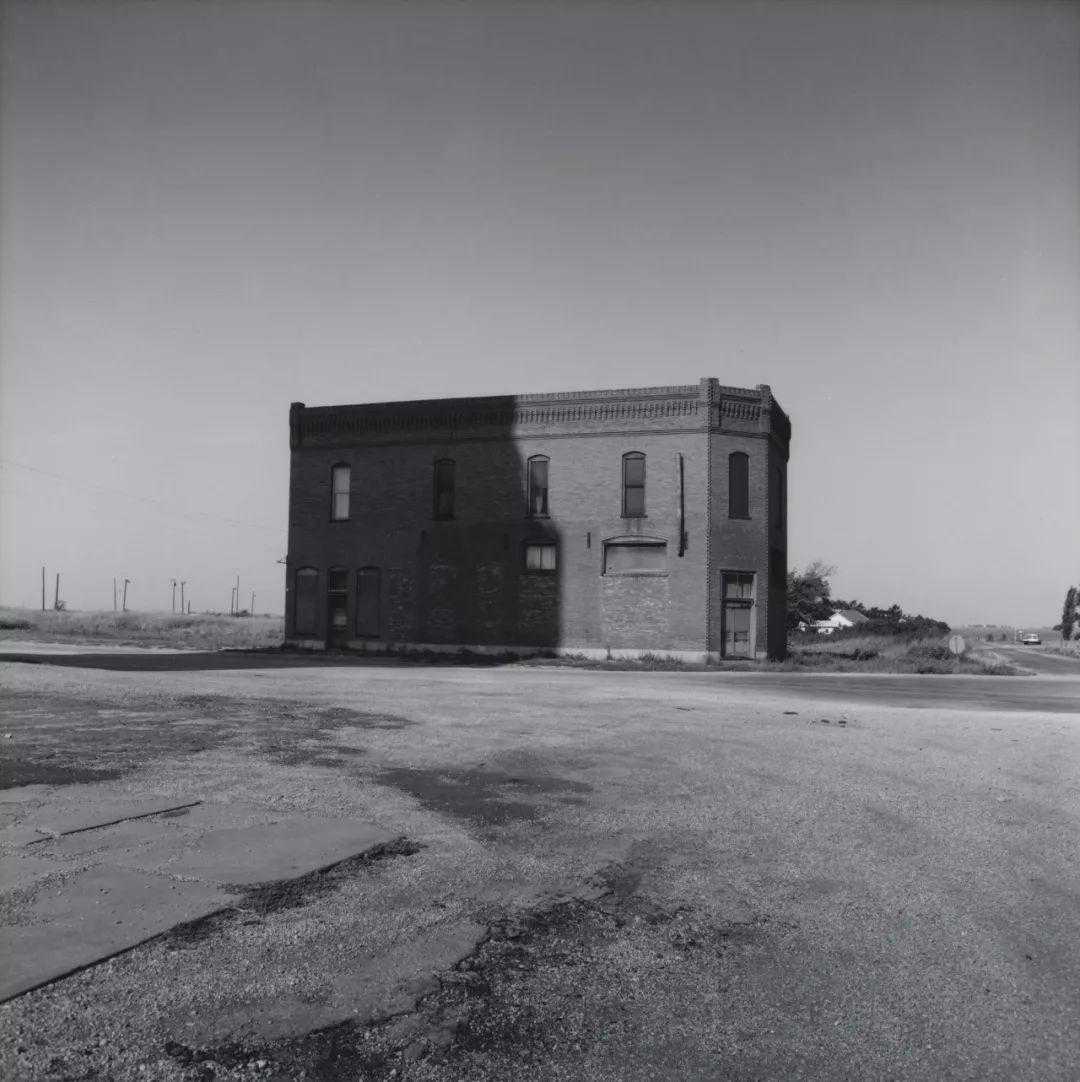 FrankGohlke《BrickBuildingintheShadowofaGrainElevator-Cashion,Oklahoma》,明胶银盐,20.9×20.7cm,1973-1974年©2019FrankGohlke