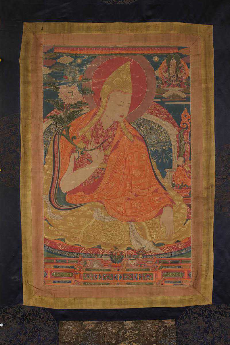 唐卡中头戴黄帽的喇嘛胸前束绳插了一支普巴杵,说明此尊为五世达赖。他虽位居格鲁派领袖,亦以支持宁玛(Nyingma)派,并拥有宁玛派传承而著名。宁玛派意为“旧派”,普巴杵为派内教法特有的法器。值得注意者,系五世达赖右手所拈,而于右肩上盛开的莲花上,可见以金线勾描的“透明”四世班禅(1567-1662)。四世班禅寻访了五世达赖,为其最重要的上师,也在五世达赖掌权过程中扮演了关键角色。