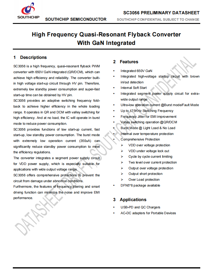 SC3055A是一款高频率、准谐振反激PWM转换器,内置了650VGaN(QR/DCM)技术,同时提供了自适应开关频率折返功能,能够在整个负载范围内实现更高的效率。