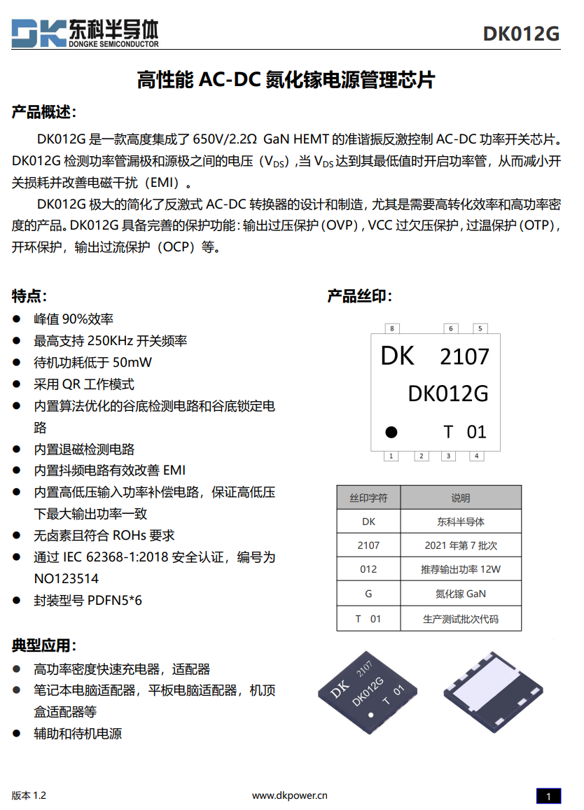 东科DK012G氮化镓合封芯片支持250KHz开关频率,待机功耗低于50mW,内置高低压输入功率补偿电路,内置高压启动,采用PDFN5*6封装,适用于氮化镓快充,电源适配器以及辅助电源应用。