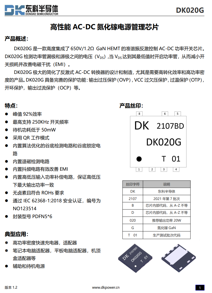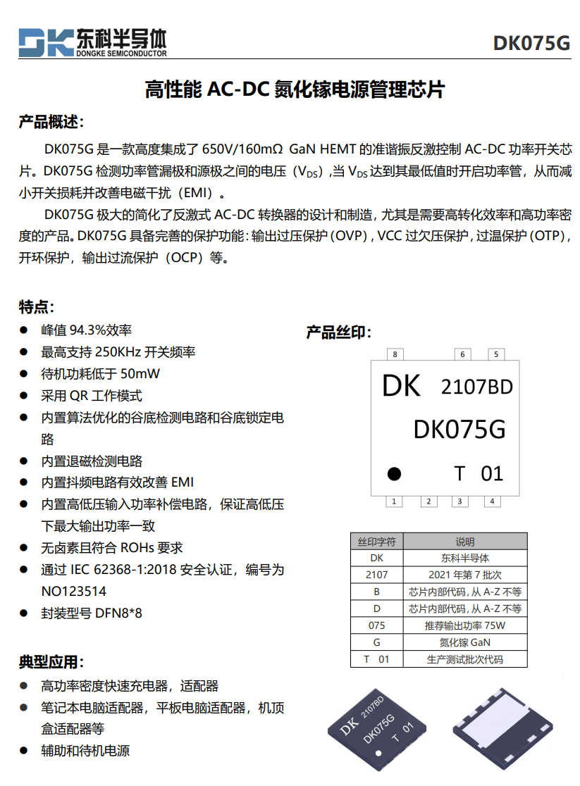 东科DK012G是一款集成了650V/2。2ΩGaNHEMT的准谐振反激控制AC-DC功率开关芯片。DK012G检测功率管漏极和源极之间的电压(VDS),当VDS达到其最低值时开启功率管,从而减小开关损耗并改善电磁干扰(EMI)。