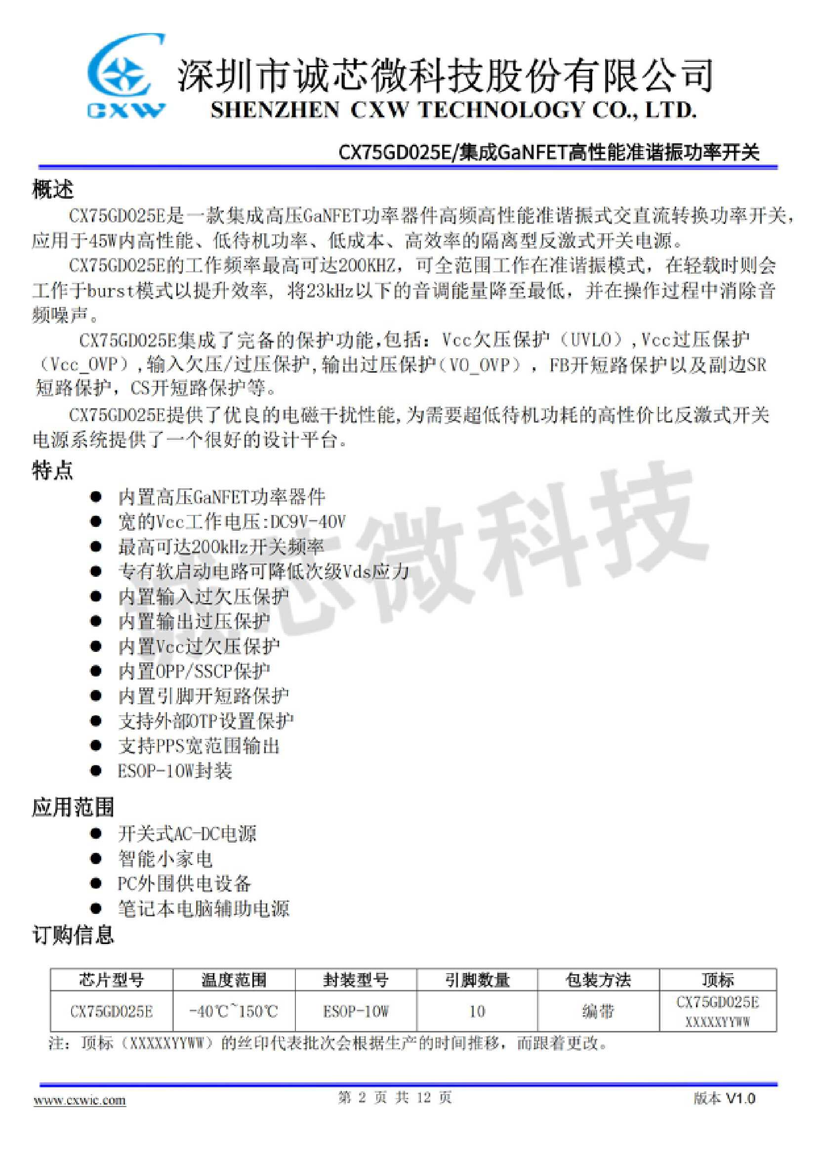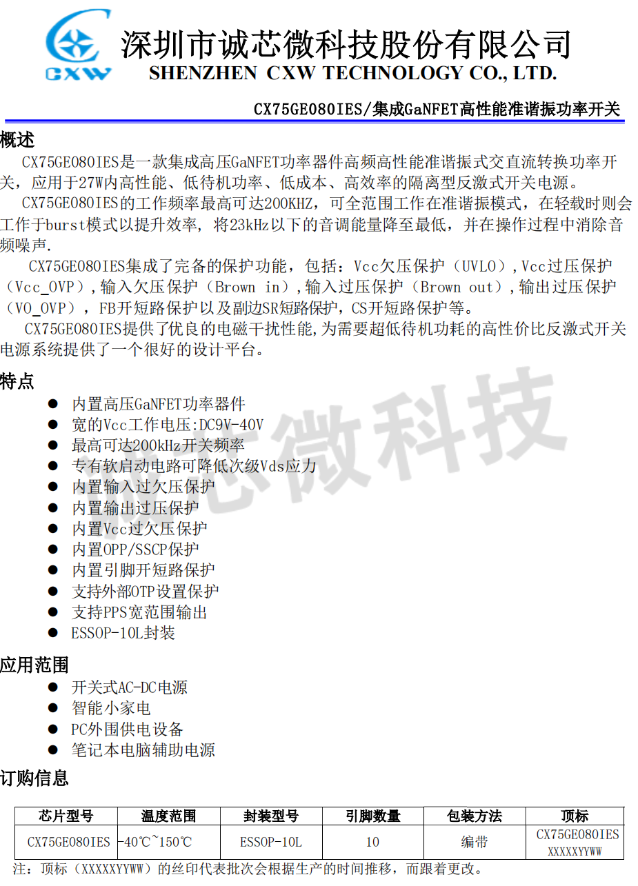 CX75GD015E内置了多重保护功能,如输入过欠压保护、输出过压保护、Vcc过欠压保护、OPP/SSCP保护以及引脚开短路保护等,确保了系统的可靠性和安全性。支持外部OTP设置保护,进一步增强了应用的安全性。CX75GD015E采用ESOP-10W封装形式安装,适用于开关式AC-DC电源、智能小家电、PC外围供电设备以及笔记本电脑辅助电源等多种场景,为各种电源应用提供高效稳定的解决方案。