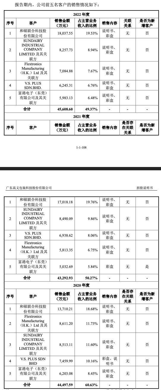 下游客户方面,公司在招股书中提到,“直接或通过代工厂商为包括微软、苹果、菲利普莫里斯、绿山咖啡、小米、徕芬、iRobot、SharkNinja、今世缘、必胜等在国内外知名品牌公司提供纸质包装产品”。相应地,前五大客户名单并不知晓终端客户的销售金额及占比。