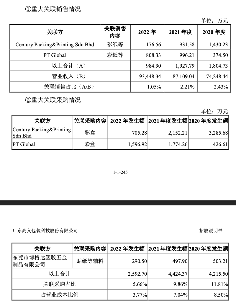 存重大关联交易界面新闻注意到,在重大关联销售及采购情况中,高义包装向CenturyPackingPrintingSdnBhd和PTGlobal既销售彩纸又采购彩盒。