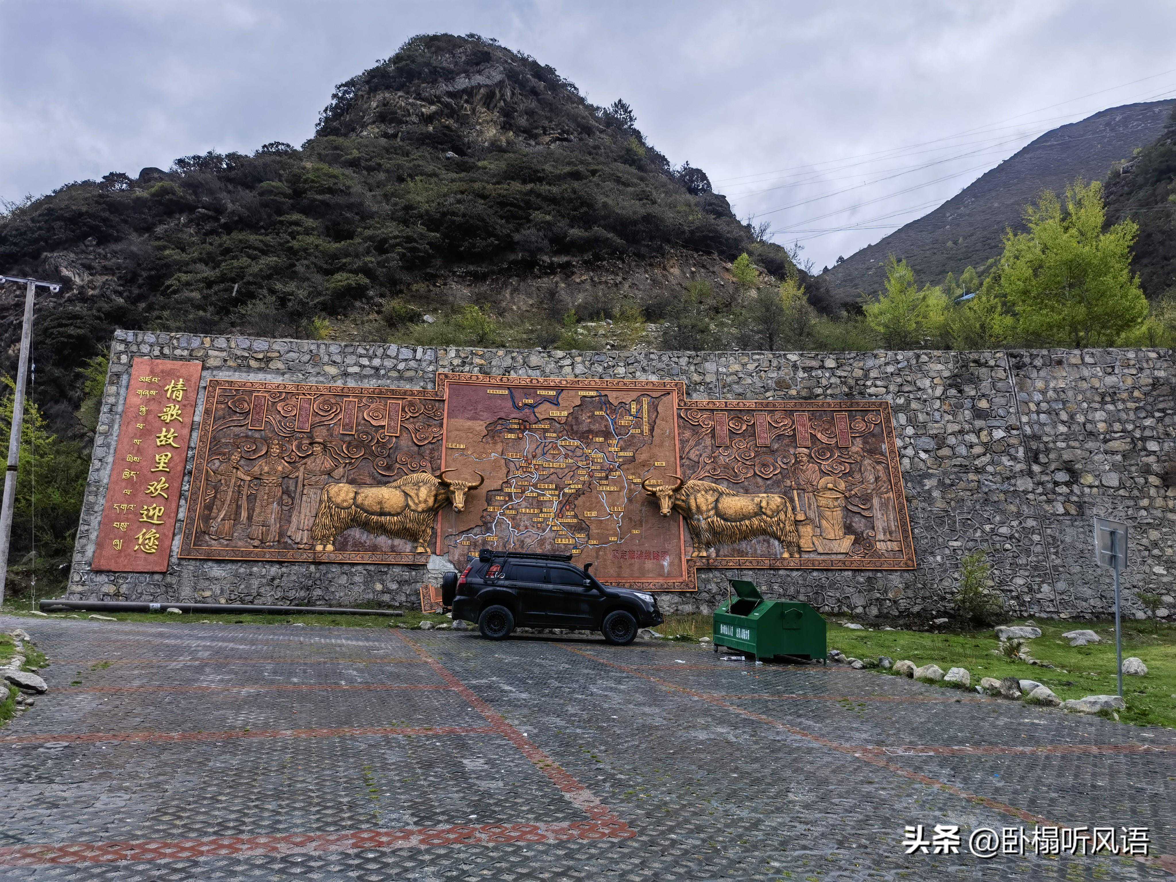 过了援藏展览馆再往前走不远,过了一座桥,马路左边有一座五颜六色的大石碑,雕刻着鲜花、白象,写着“鲁朗”。石碑下面的地板写着鲁朗的海拔,以及鲁朗距离北京、上海、巴黎等地的直线距离。