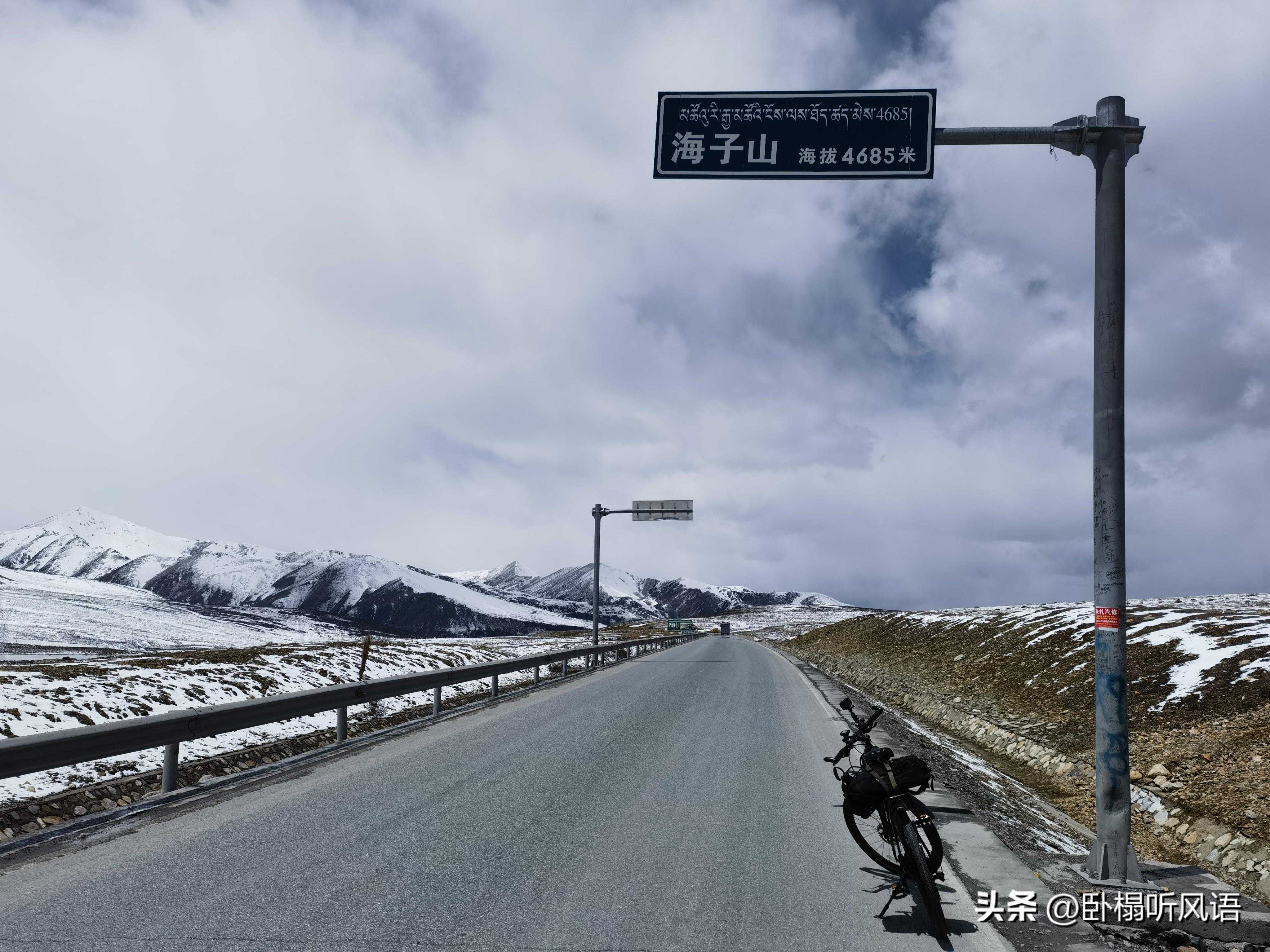 全程路况都很好,起伏路段,上下坡大约各占一半。出门就是16km的天路十八弯,先后翻越剪子弯山、尼玛贡神山、柴可柯、拉乌柯、卡子拉山、雪域天空之城。国道一路修到了山脊之上,曲折蜿蜒,山脊风巨大,险些把我吹沟里去。卡子拉山天气多变,天气晴朗,时不时就飘落雪花和冰渣子。