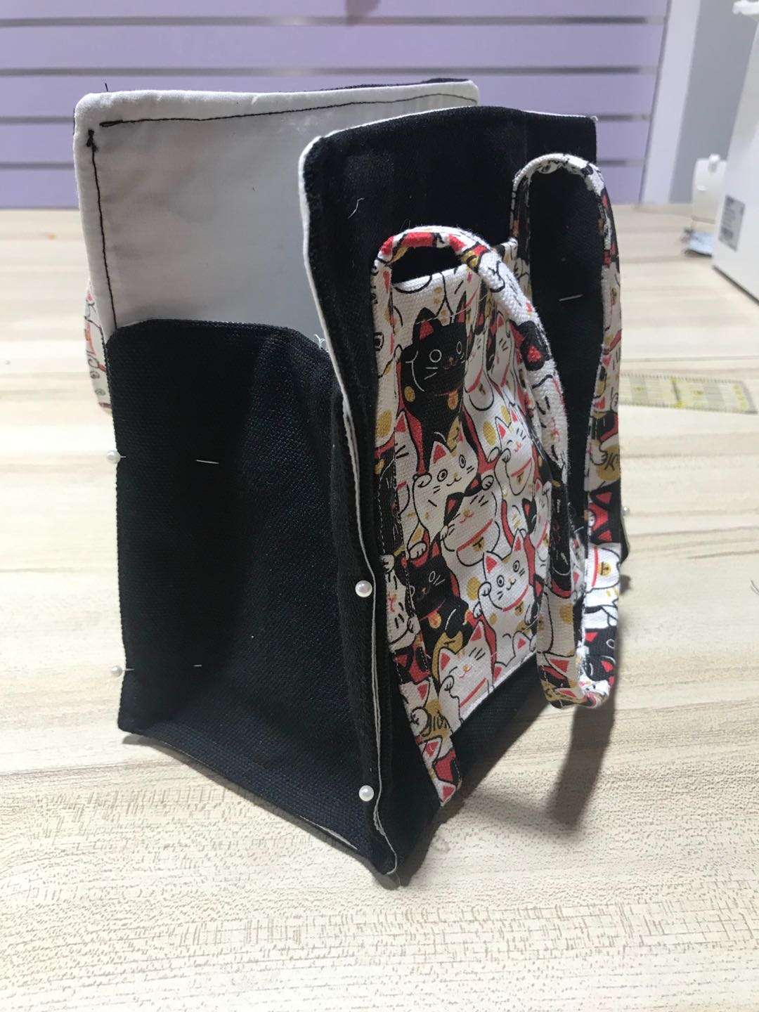 将处理好的贴袋和袋子用珠针固定在表布上,(注意左右距离要对称)沿带子压线