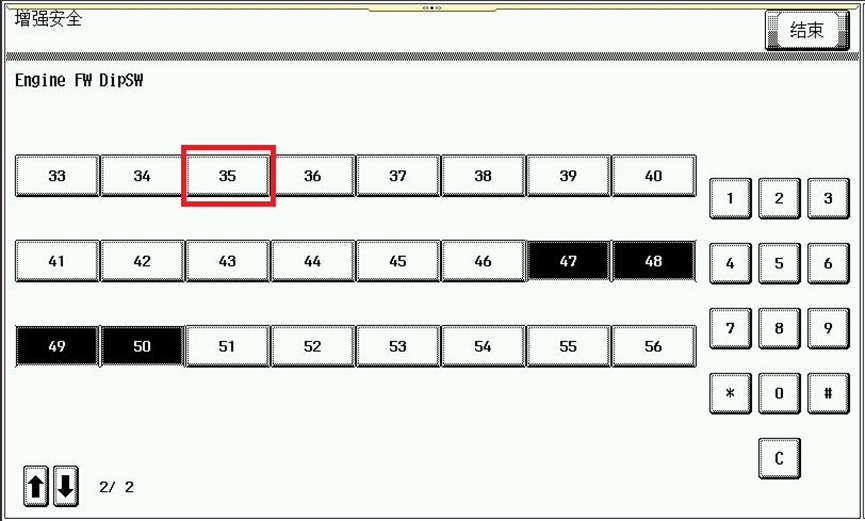 2、点屏幕右上角的【菜单】,点左上角的【计数器】,点【显示小键盘】,依次输入【停止键00停止键01】,若维修模式有密码,则为【9272927292729272】,进入柯尼卡美能达C368【维修模式】,按【停止0C】,进入【增强安全模式】;点【EngineFWDipSW】(引擎固件Dip开关)。