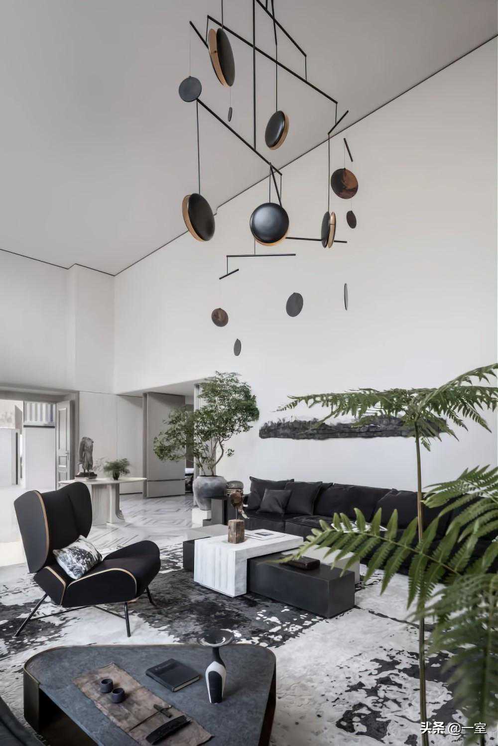 挑空开放的门厅及客厅,家具陈列呈现不规则形态,像艺术品一般来进行陈列。墨黑的沙发、巨型水墨地毯、墙面的纸墨装置,都阐述出了东方美学的水墨文化。