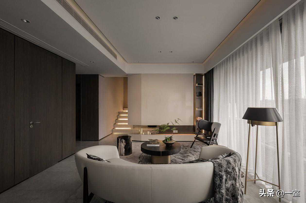 楼梯在空间中除了满足必要的功能,还像是一件艺术品,具有装饰性,丰富了空间层次。