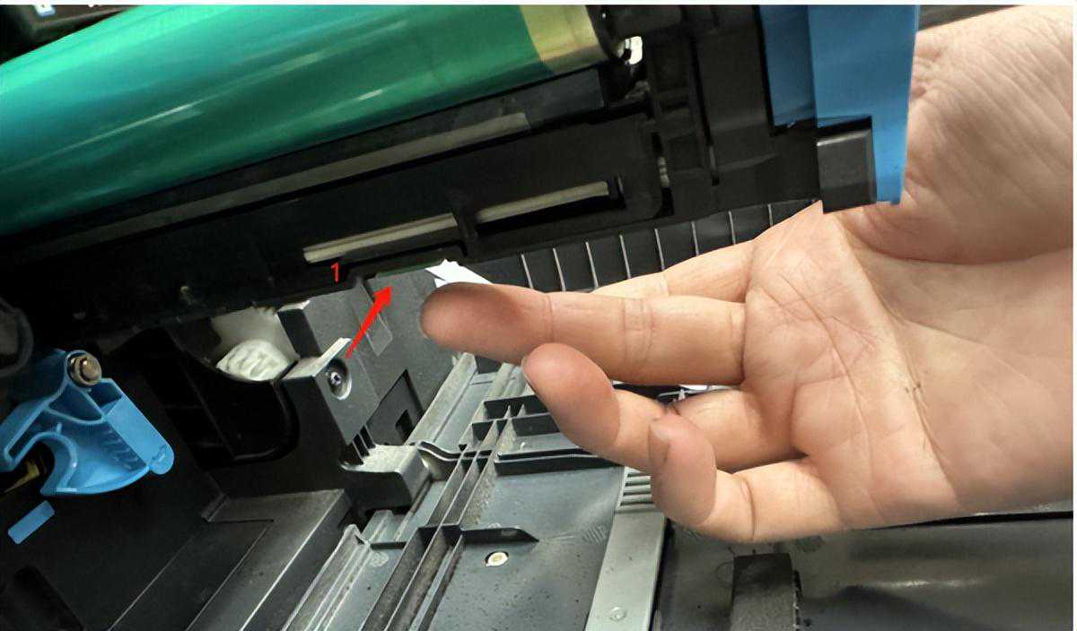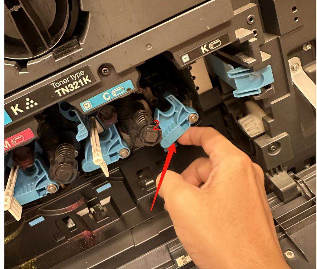 3、第三步、我们可以把套鼓整个拿出来,后把锁紧套鼓的这个蓝色卡扣打上去、用螺丝刀包裹抹布擦一下里面硒鼓芯片和机器接触的金属脚,后装回去问题没解决。