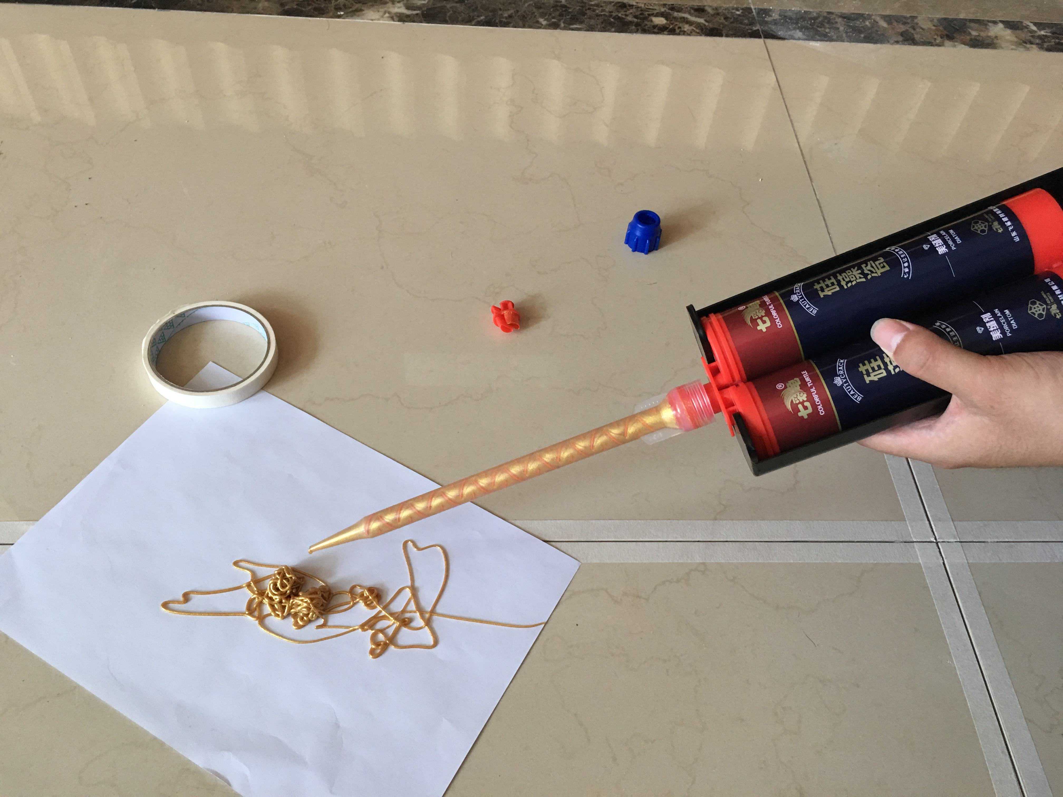 用瓷缝剂填缝,挤出来的时候,它们会混合在一起固化反应,不会像传统美缝剂那样与湿气反应形成塌陷。凝固后的填缝剂非常坚硬,敲在上面就像敲在陶瓷上。