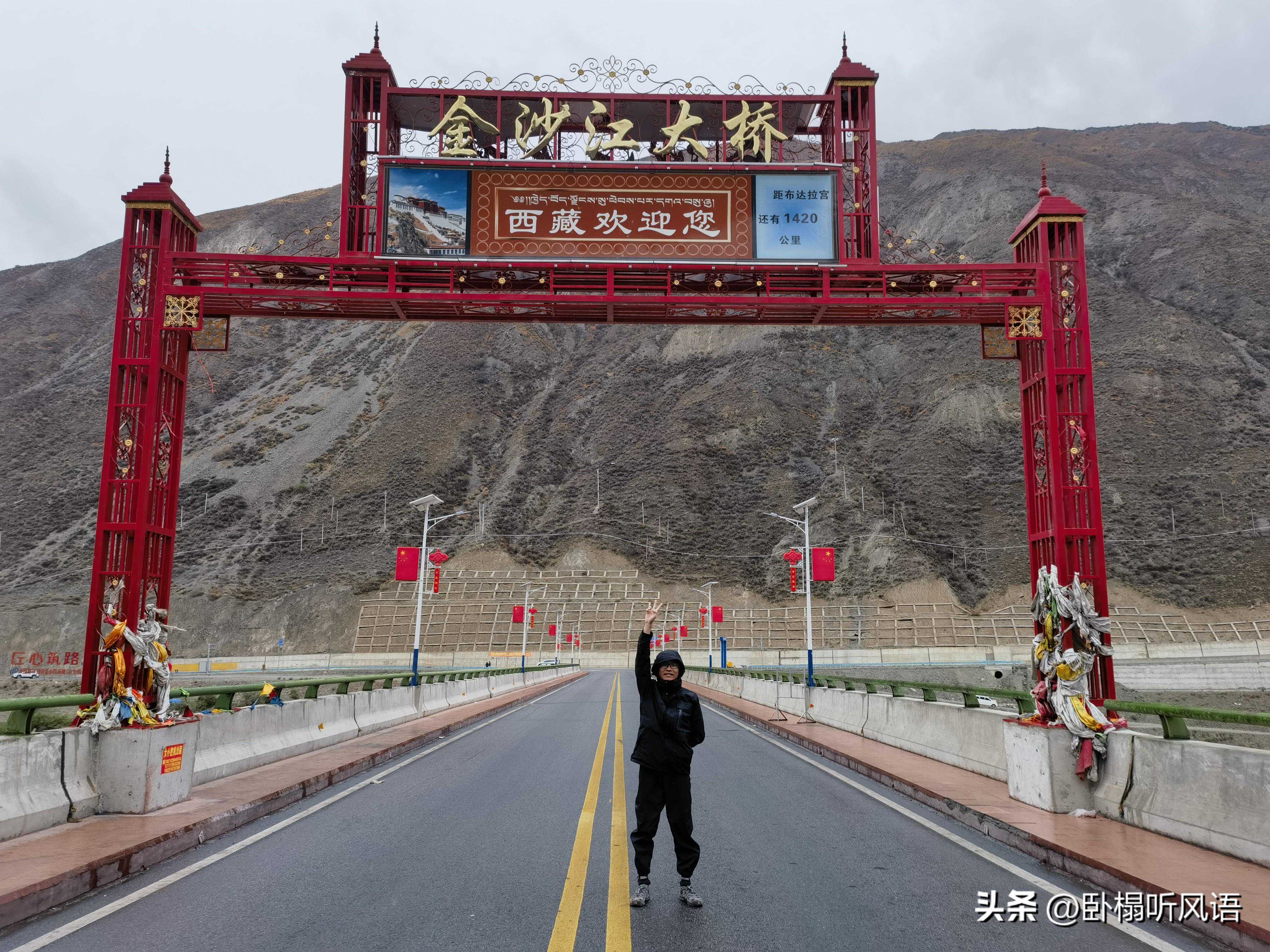 走G215沿金沙江溯游而上,金沙江的水跟黄河一样浑浊。开始大约10km下坡,再骑23km平路,总计在33km后到达金沙江大桥,正式进入西藏界!