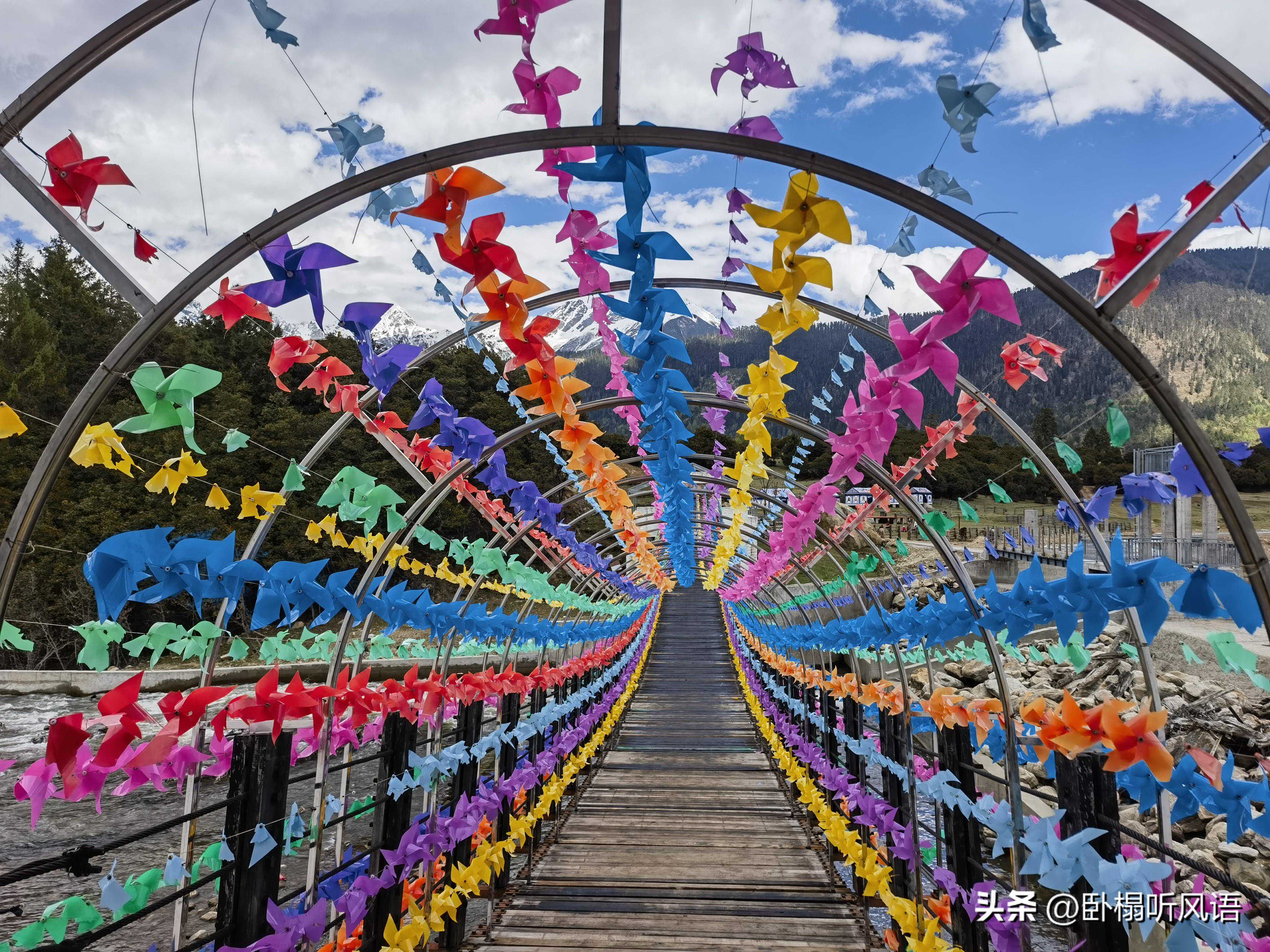 刚进入小镇,看到一个扎塘鲁措吊桥,吊桥被一圈一圈五颜六色的纸风车,像童话一样梦幻。走过吊桥有一个庄园,可以骑马,骑马免费射箭。40一小圈,50一大圈,15分钟。可以不用人牵着,随便撒欢,摔着了别讹人家就行。