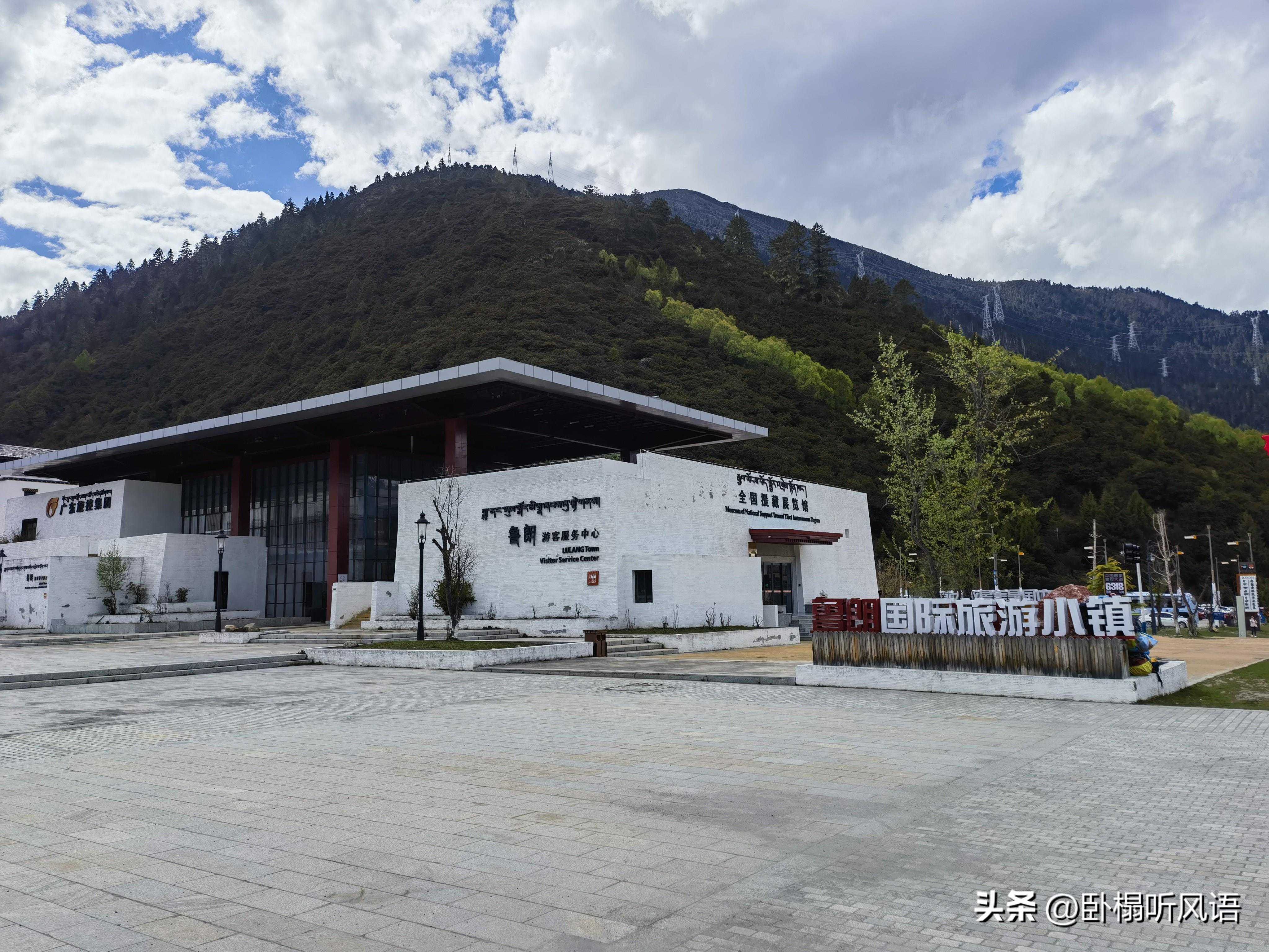 过了援藏展览馆再往前走不远,过了一座桥,马路左边有一座五颜六色的大石碑,雕刻着鲜花、白象,写着“鲁朗”。石碑下面的地板写着鲁朗的海拔,以及鲁朗距离北京、上海、巴黎等地的直线距离。