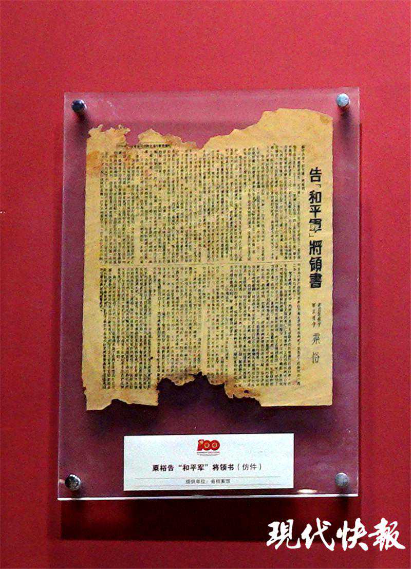 展馆中有一面"华中抗日根据地档案集萃"的展墙,布满了各类档案,煞是壮观,引得观众驻足观看。这其中,有一张泛黄破损的宣传单页。现代快报记者注意到,这是一份《告"和平军"将领书》,上面密密麻麻的文字,反映出的是苏中抗日根据地在矛盾交织、斗争错综复杂的环境下对日伪军的斗争策略。