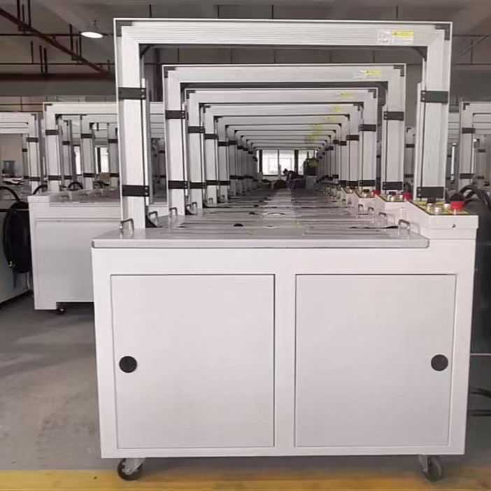 ②半自动捆包机。用输送装置将包装件送至捆扎工位,再用人工将带子缠绕包装件,最后将带子拉紧固定。它工作台面较低,很适合大型包装件的捆扎。