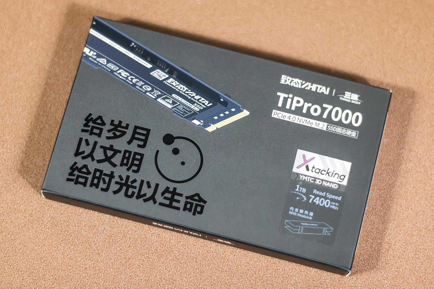 包装盒的正面左下角印有《三体》名句:“给岁月以文明,给时光以生命”,右侧印有固态硬盘型号容量版本与标称传输速度,致态TiPro7000三体联名版固态硬盘目前有1TB与2TB两个容量版本可选,1TB版本标称读写速度为7400M/s与5400MB/s,而2TB版本写入速度更高可达6700MB/s。