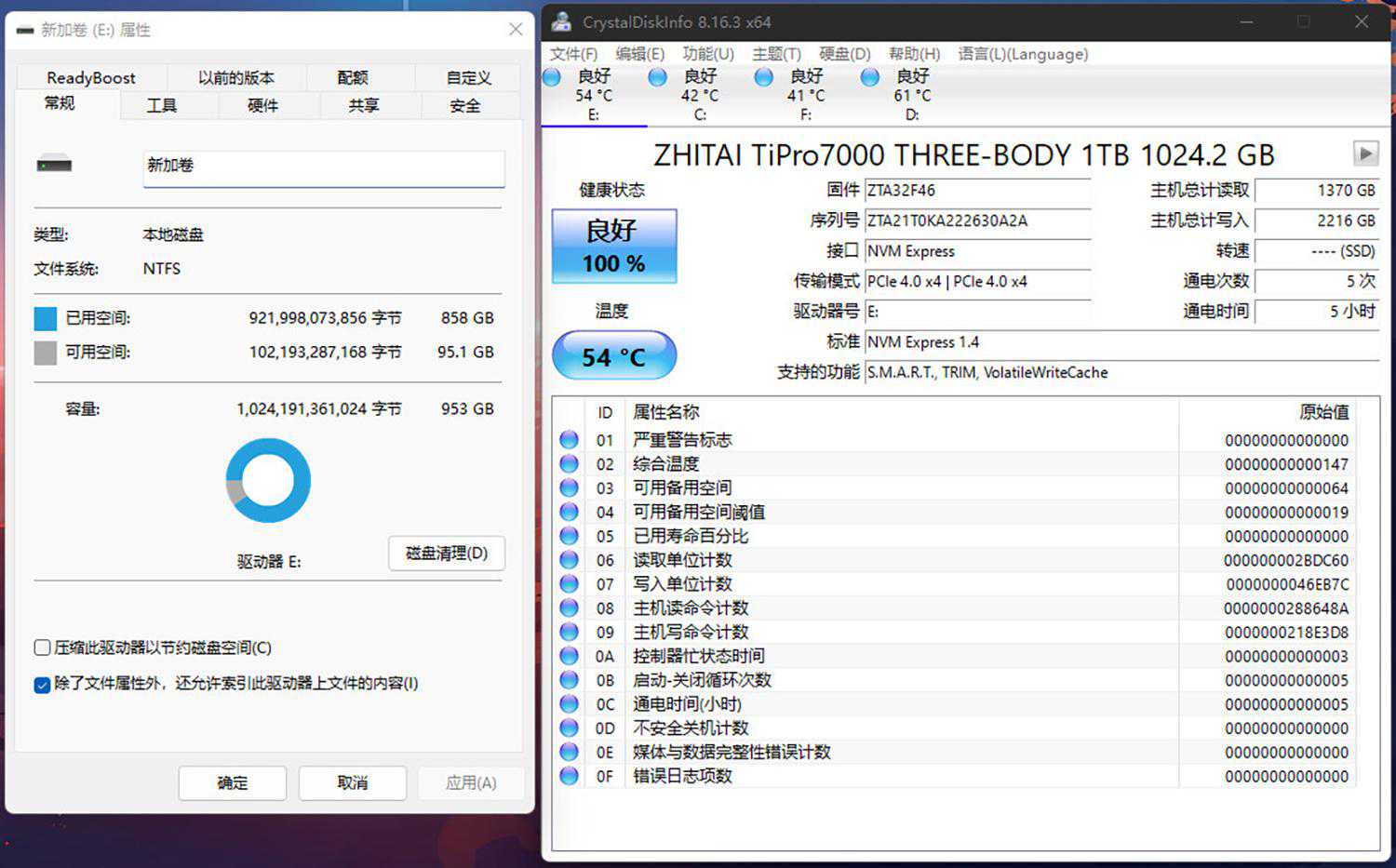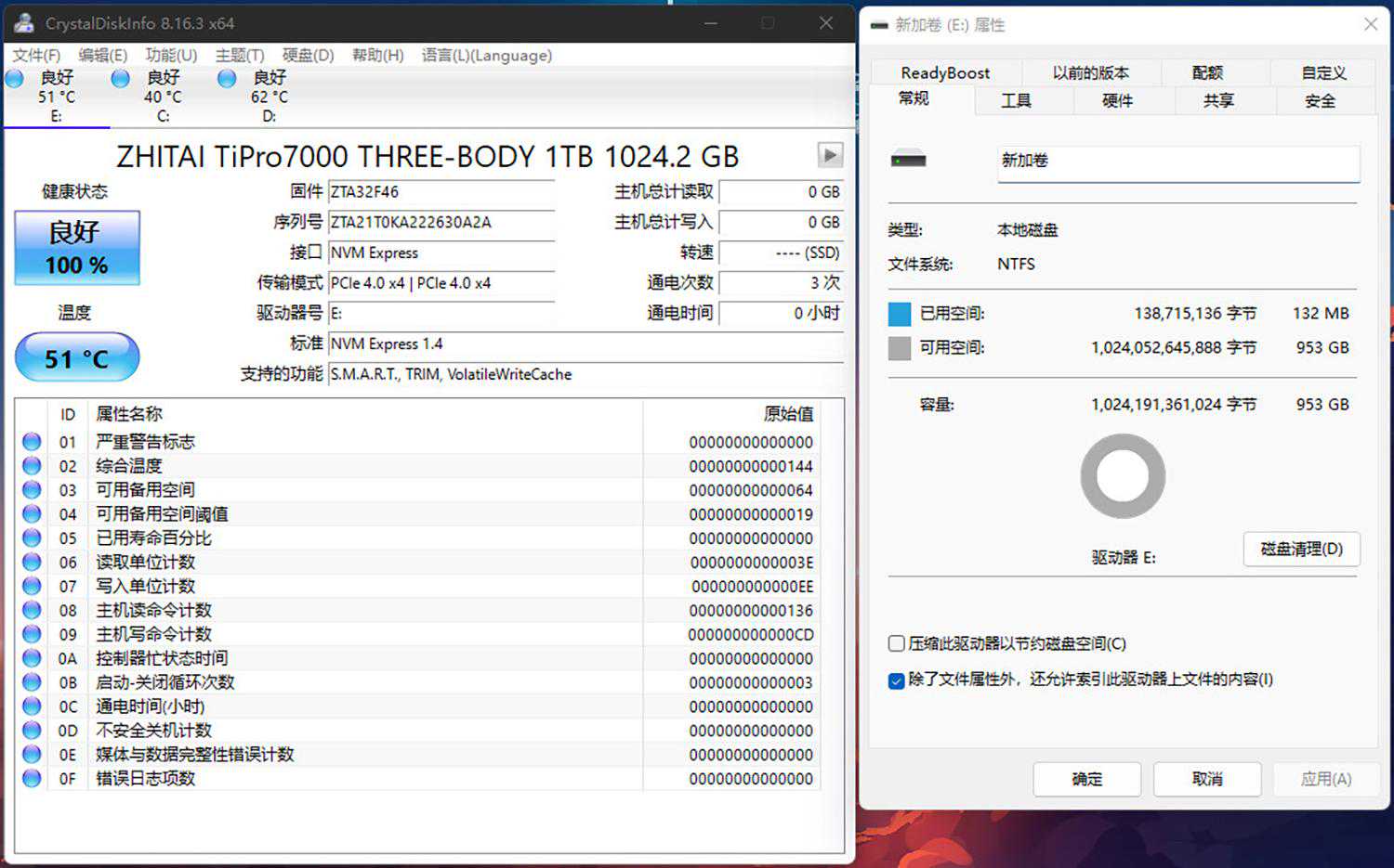 首次安装使用需对固态硬盘进行适当的分区,根据CrystalDiskInfo软件中的检测状态信息可知,致态TiPro7000三体联名版固态硬盘支持协议,并工作在总线通道之下,固态硬盘的固件版本是最新ZTA32F46,格式化后实际可用容量为953GB(1TB容量版)。