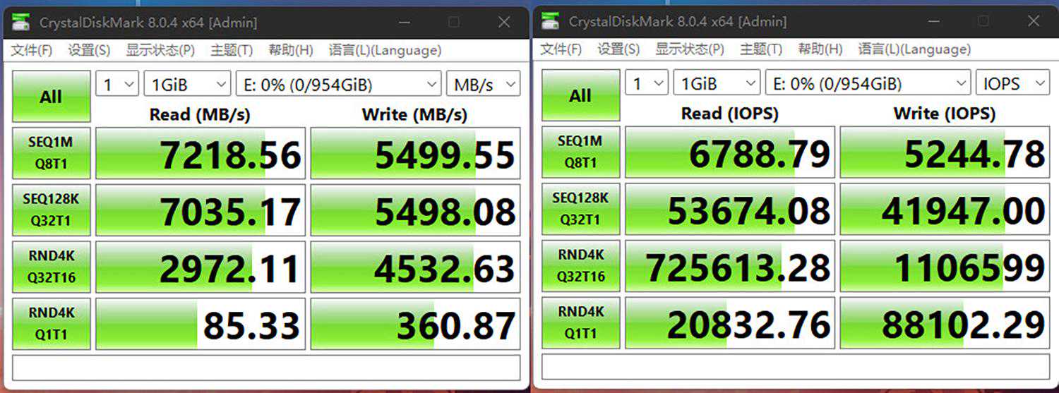 接下来对固态硬盘进行基准测试,在CrystalDiskMark8软件中选择1GB数据容量模式,实测固态硬盘的顺序读写速度分别为7218MB/s与5499MB/s,几乎达到总线通道的带宽上限,而4K随机读写速度为85MB/s与360MB/s。