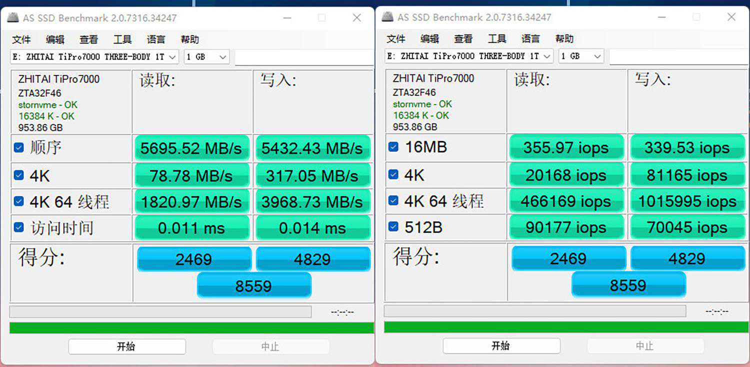 ASSSDBenchmark基准性能测试软件,选择1GB数据容量模式测试,致态TiPro7000三体联名版固态硬盘的顺序读写速度分别为5695MB/s与5432MB/s,4K随机读写分别为78MB/s与317MB/s,读取延迟时间为0.011ms,固态硬盘总得分为8559分。