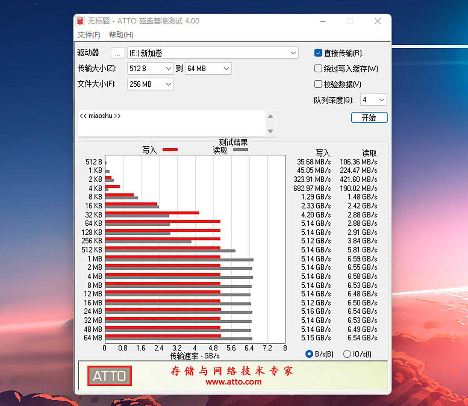 ATTO基准测试软件,通过不同大小的数据测试包对固态硬盘进行读写测试,致态TiPro7000三体联名版固态硬盘在0.5KB小文件读写速度能达到106MB/s与35MB/s,从数据体积1MB以上读写速度可达6.59GB/s与5.16GB/s。
