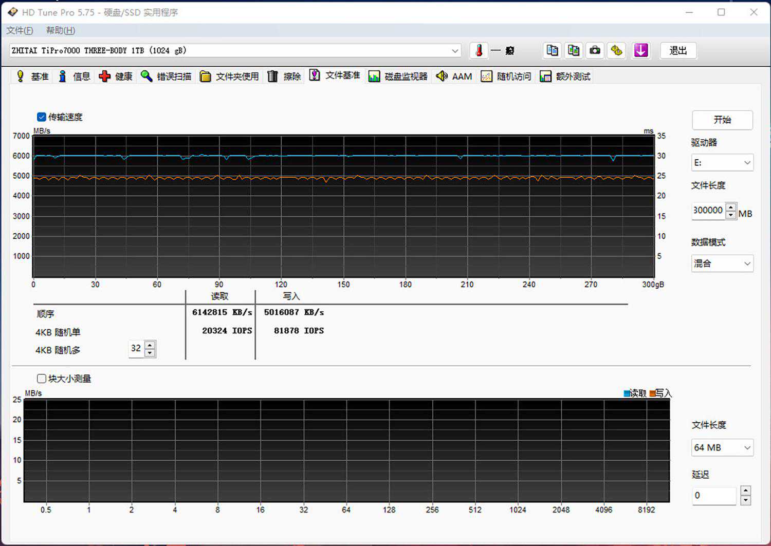 HDTunePro基准测试软件,测试数据量为300GB(最大只能设为300GB,再往上软件会报错),并选择混合数据模式,从实际测试结果来看,在空盘状态下,固态硬盘的读写速度全程能保持在6GB/s与5GB/s左右,写入速度未出现下降。