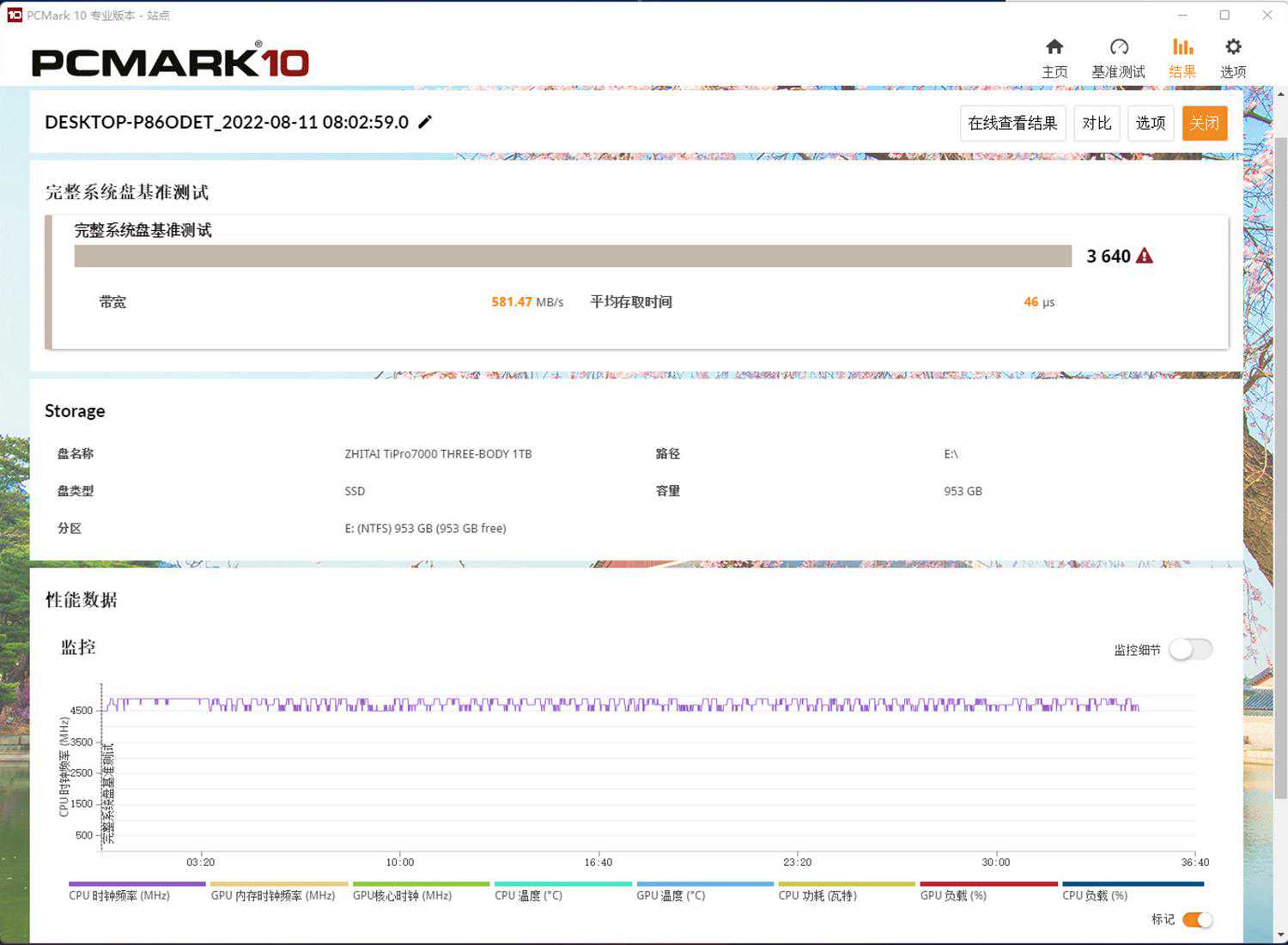 PCMark10基准测试软件,硬盘性能测试具备多个不同项目可选,先选择完整系统盘基准测试项目,模拟作为系统盘使用状态,致态TiPro7000三体联名版固态硬盘的测试成绩为3640分,测试带宽为581.47MB/s,平均存取时间为0.046ms。
