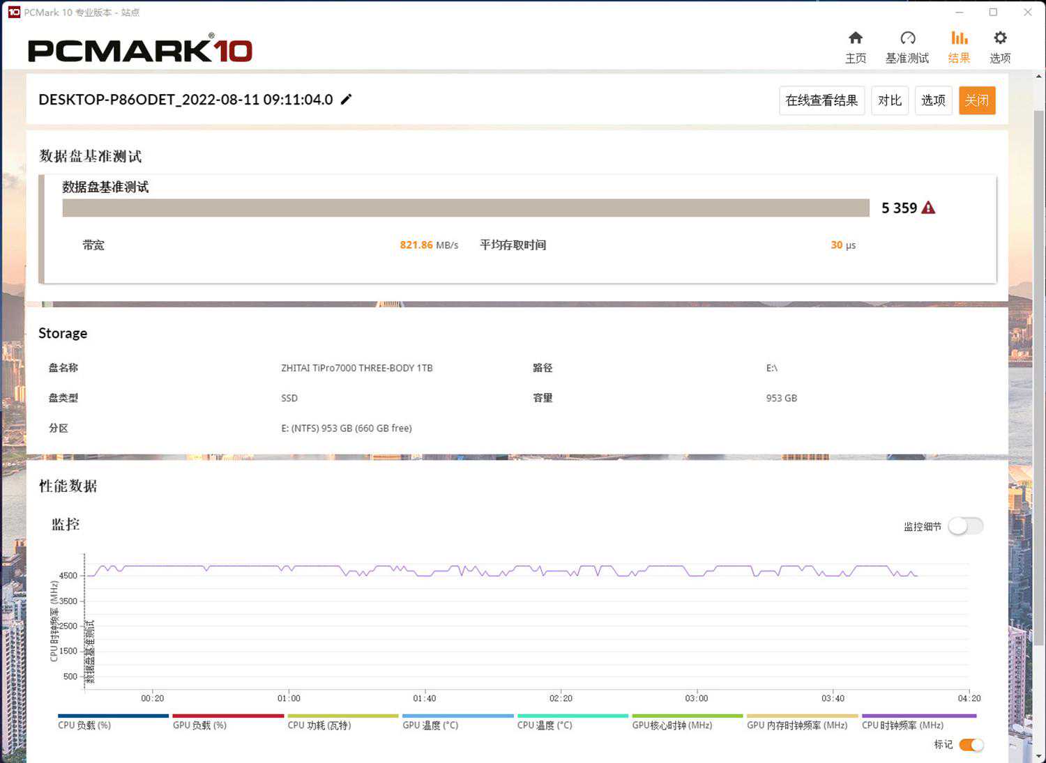 数据盘基准测试项目,模拟作为数据盘使用状态,由于测试内容较少测试运行时间较短,致态TiPro7000三体联名版固态硬盘在该项目的测试成绩为5359分,测试带宽为821.86MB/s,平均存取时间为0.03ms。