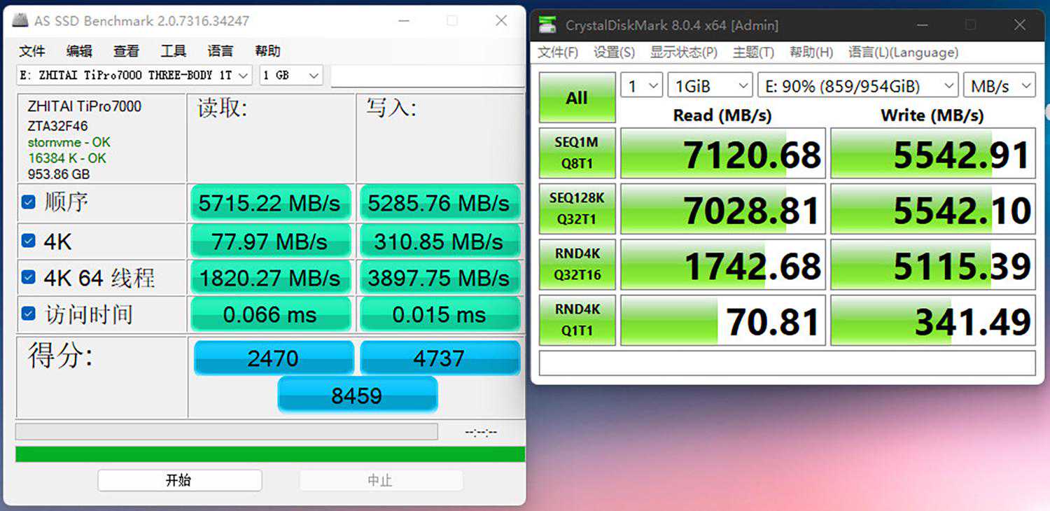 ASSSDBenchmark基准测试软件,测得固态硬盘在90%存储空间占用率下的顺序读写速度分别为5715MB/s与5285MB/s,总得分为8459分,而在CrystalDiskMark8基准测试软件中,顺序读写速度分别为7120MB/s与5542MB/s。