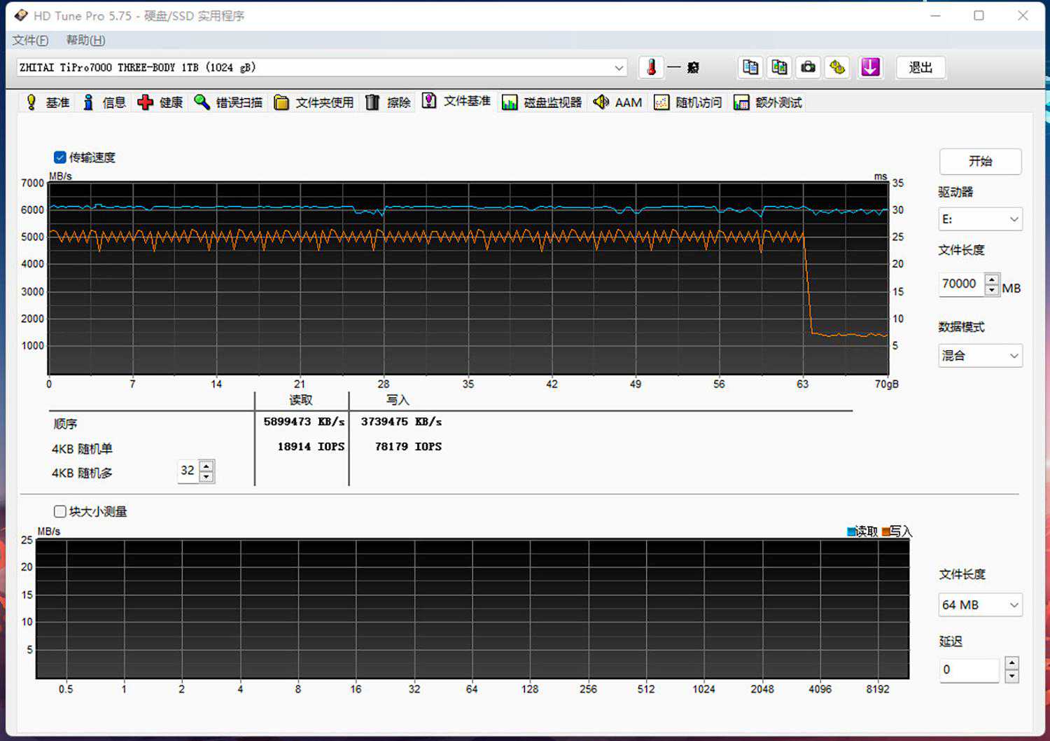 HDTunePro基准测试软件,设测试数据量为70GB混合模式,从测试结果来看,在90%存储空间占用率下,SLC缓内读取速度为6GB/s,全程未出现降速,写入速度可达5GB/s,当SLC缓存空间耗尽,写入速度会降至1.5GB/s左右。